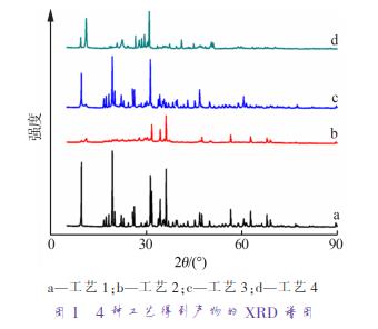 從圖2可以看到,直接法不加活性劑的產(chǎn)物呈塊狀,顆粒粗大,大小不一(圖2a),而直接法加活性劑制備的產(chǎn)物呈片狀,顆粒較不加活性劑的略小,仍為微米級產(chǎn)品(圖2b);如果采用直接法攪拌反應(yīng)然后再研磨的方法,盡管顆粒大小較前2種小,但仍然可以看到有塊狀顆粒,且顆粒大小不一(圖2c);另外,即使采用研磨法反應(yīng),但不加活性劑,顆粒呈團(tuán)聚狀,發(fā)生二次團(tuán)聚(圖2d)。因此得到結(jié)論:與直接法攪拌反應(yīng)相比,研磨法、添加表面活性劑能有效地降低顆粒大小,而將二者結(jié)合不能降低一次顆粒的尺寸,還可以避免顆粒的二次團(tuán)聚。故本實驗采用